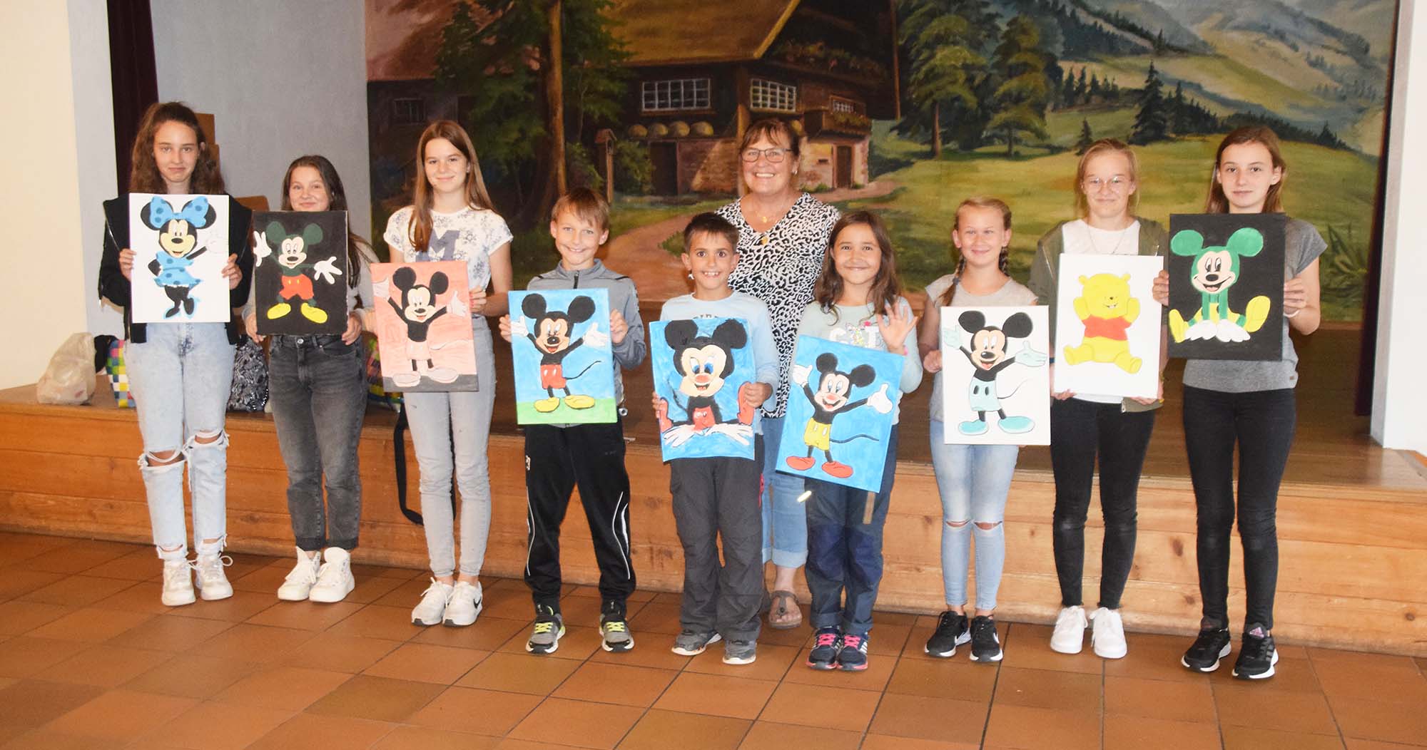 Seit über 25 Jahren leitet Cornelia Göhringer die Kreativwerkstatt der Winkelwaldklinik Nordrach. Sie hatte sich bereit erklärt, für das Sommerferienangebot des Bildungswerks das Malen mit dem Farbmittel Gouache zu üben. Gouache ist ein wasserlösliches Farbmittel und vereint die Eigenschaften der Öl- und Aquarellfarbe. Cornelia Göhringer hatte verschiedene Comic-Motive vorgezeichnet. Die Mickey Maus machte eindeutig das Rennen und wurde gleich achtmal portraitiert.