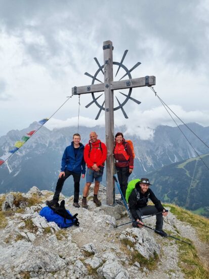 Das Ziel für den nächsten Tag war der Weg zur Franz-Senn-Hütte, welcher mit über 1.100 Höhenmetern Auf- sowie Abstieg die anspruchsvollste Etappe werden sollte. Zu Beginn blieb die Gruppe von den vorhergesagten Regengüssen verschont, nur der Nebel versperrte die Sicht. Nachdem der Gamskogel bestiegen war, klarte die Sicht unerwartet auf und der Anblick der umliegenden Berglandschaft erhellte die Stimmung der Wanderer schlagartig.