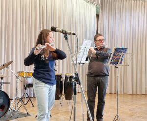 Es folgten nach einer kurzen Umbaupause Solis, Duette und im Register vorgetragene Musikstücke der jungen Musiktalente. Die Ausbilder Annette Tafler und Eduard Scharich waren dabei zum Teil auch Duett Partner der Schüler.