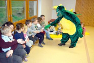 Groß wurden da die Kinderaugen – es gibt ihn wirklich den kleinen Drachen Nordi. Persönlich begrüßten beide jedes Kind und die Kindergartenkinder ließen es sich nicht nehmen, einen kleinen Tanz aufzuführen. Freudestrahlend bekam Nordi schließlich das Lied „Stups der kleine Osterhase“, vorgesungen.