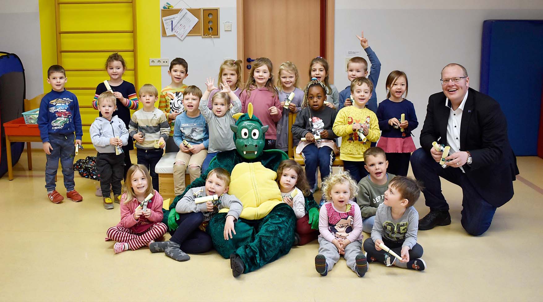 Doch für diesen Tag konnte spontan eine gute Lösung gefunden werden. Schlüsselfigur war hier Bürgermeister Carsten Erhardt, der den Kindern durch seinen fast täglichen Besuch im Kindergarten bereits bestens bekannt war. „Wenn ihr nicht zum Nordi gehen könnt, dann bringe ich den Drachen eben zu Euch in den Kindergarten.“