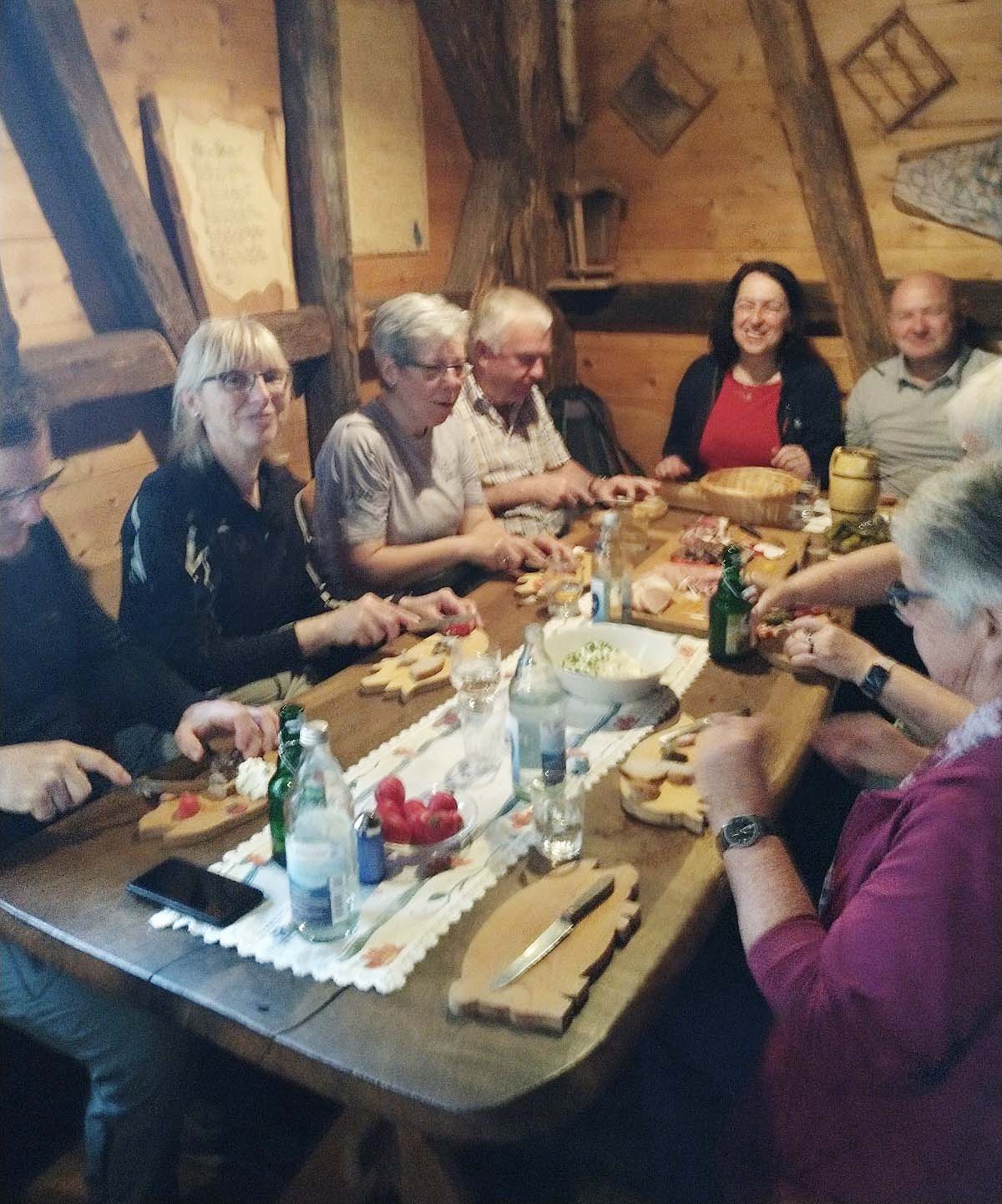 Nachdem Anneliese mit einem Geburtstagslied begrüßt wurde, tischte Erich Schätzle und sein Team ein hervorragendes Vesper, einen guten Most und weitere Getränke auf. In geselliger Runde saß man zusammen und genoss die heimelige Atmosphäre der Berglerhütte, bevor man – teils zu Fuß, teils mit dem Pkw – wieder den Heimweg antrat.