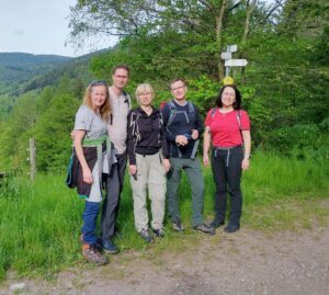 Bei strahlendem Sonnenschein startete ein Teil der Gruppe bei der Hansjakob-Halle in Nordrach. Vorbei am Judenfriedhof ging es übers Mailes Eckle zum Schwaibacher Eck. Hier stärkte man sich mit Likör, bevor es weiter zur Berglerhütte ging.