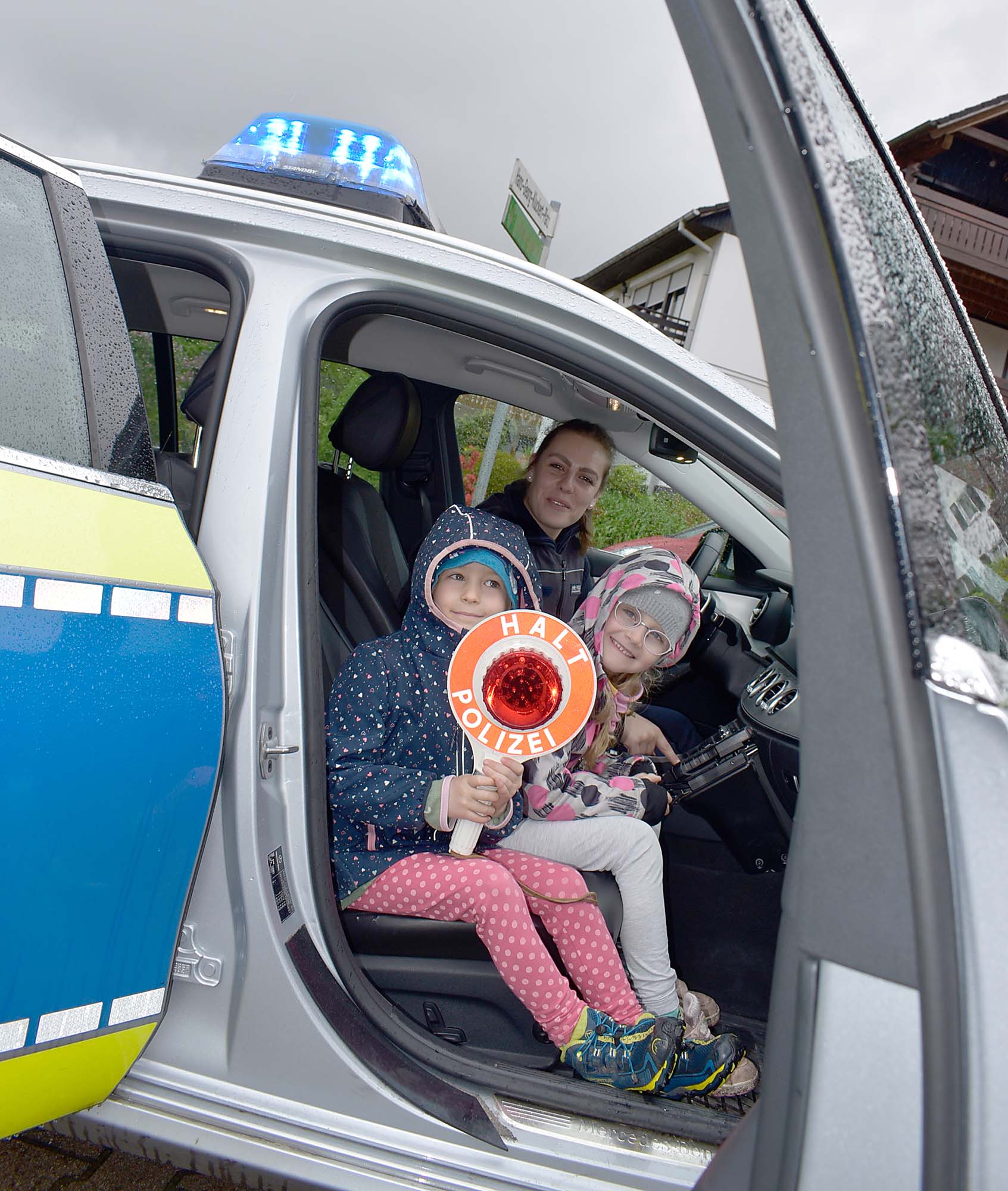Absolutes Highlight war, dass jedes Kind in das Polizeiauto sitzen und sogar das Blaulicht anschalten durfte. Zum Abschluss gestaltete sich jedes Kind noch einen Hilfspolizistenausweis mit dem eigenen Fingerabdruck. Auch die Polizisten erhielten ein Geschenk: eine kleine Holztafel mit den Fingerabdrücken und den eingravierten Namen der Kinder.