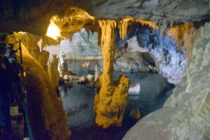 Der Übergang vom Boot in den dämmrigen Höhleneingang war eine wacklige Angelegenheit. Unmittelbar dahinter stieß man verwundert auf einen grünlich funkelnden See. Im Gänsemarsch ging es durch die bizarre Welt der Kristalle und Tropfsteine. Von der Decke in einem mächtigen Gewölbe hingen lange verästelte Fäden herab. Man meinte in den exzentrischen Gebilden Tiergestalten und Märchenfiguren zu erkennen. „Unser sardisches Fantasialand“, schmunzelte Reiseleiter Sergio.
