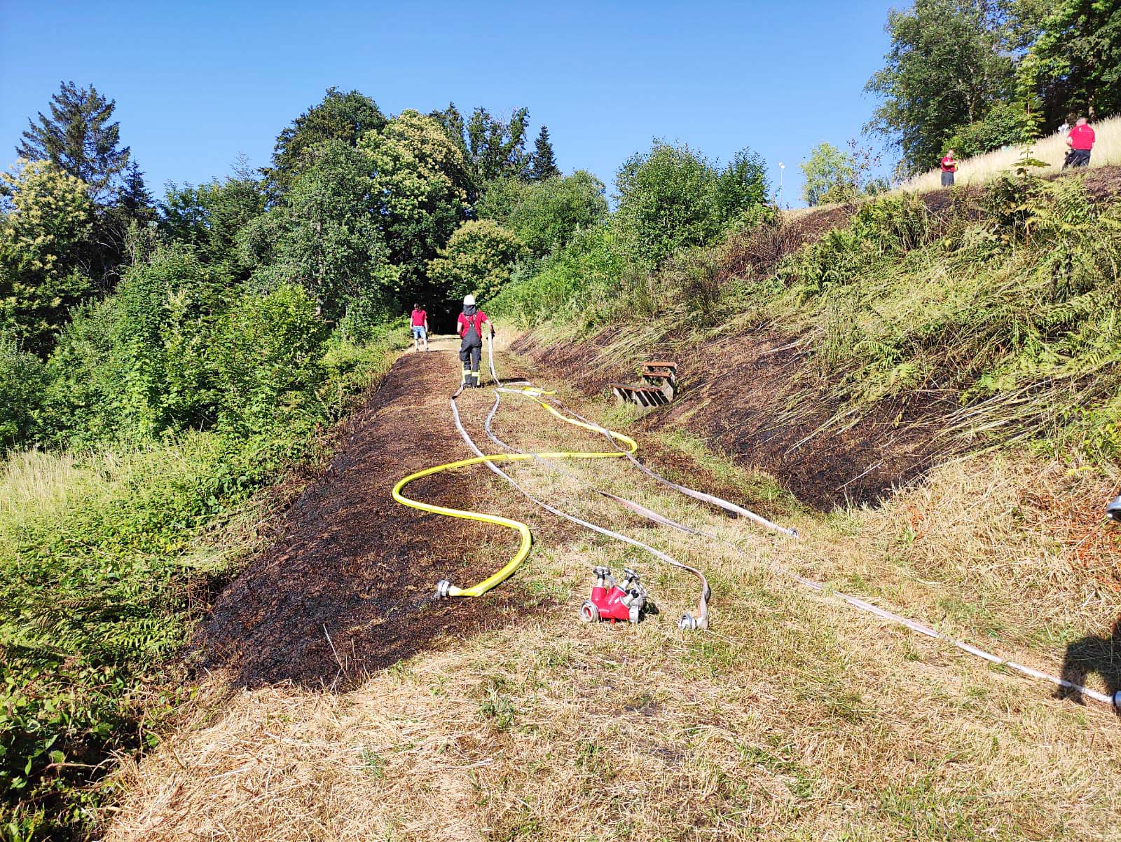 Nach rund einer Stunde war der Einsatz dann beendet. Auf Grund der an diesem Tag extremen Temperaturen kamen die Einsatzkräfte entsprechend verschwitzt ins Gerätehaus zurück. Hier kam es dann zu einer sehr schönen Geste, als die noch recht zahlreichen Gäste des Sommerfestes sie mit spontanem Applaus empfingen. Vom Gerätehaus hatte man Sichtkontakt zur Einsatzstelle, wodurch man das Geschehen live aus der Entfernung verfolgen konnte.