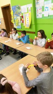 Bei den jüngeren Kindern geht es vor allem zunächst darum, dass sie den KLARO kennenlernen, ihn zu basteln hilft dabei. Gemeinsam mit der zu einem Freund gewordenen Symbolfigur erfahren sie dann unter anderem, was es mit der Nahrungspyramide auf sich hat und wie der Weg des Blutes ist. „Auch richtig zu atmen ist ein ganz großes Thema“, erklärt die Rektorin. Per Blasrohr, mit dem die Kinder einen federleichten Ball in der Luft zu halten versuchen, erlernen die Kinder die „Klaro-Atmung“.
