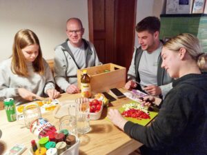 Am Abend fanden sich die Wanderer mit den Gastgebern zum gemeinsamen Kochen zusammen. Hier entstanden nicht nur Mahlzeiten, sondern auch Freundschaften. Der gemütliche Abend endete mit Kartenspielen und lebhaften Erzählungen.