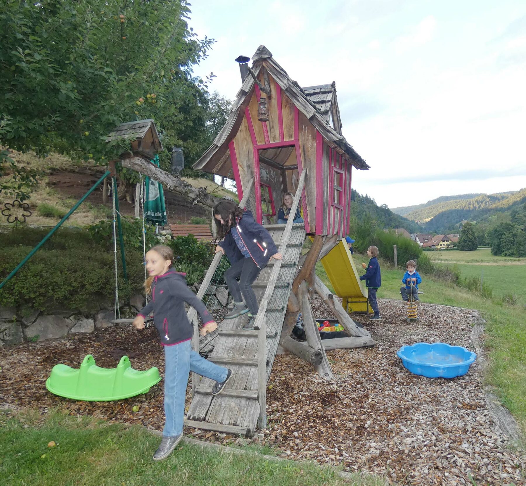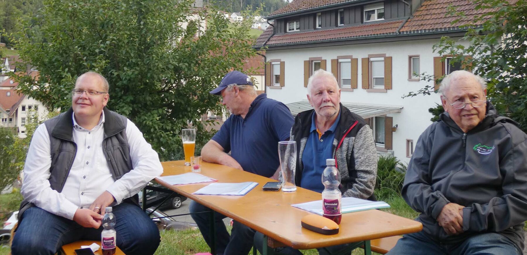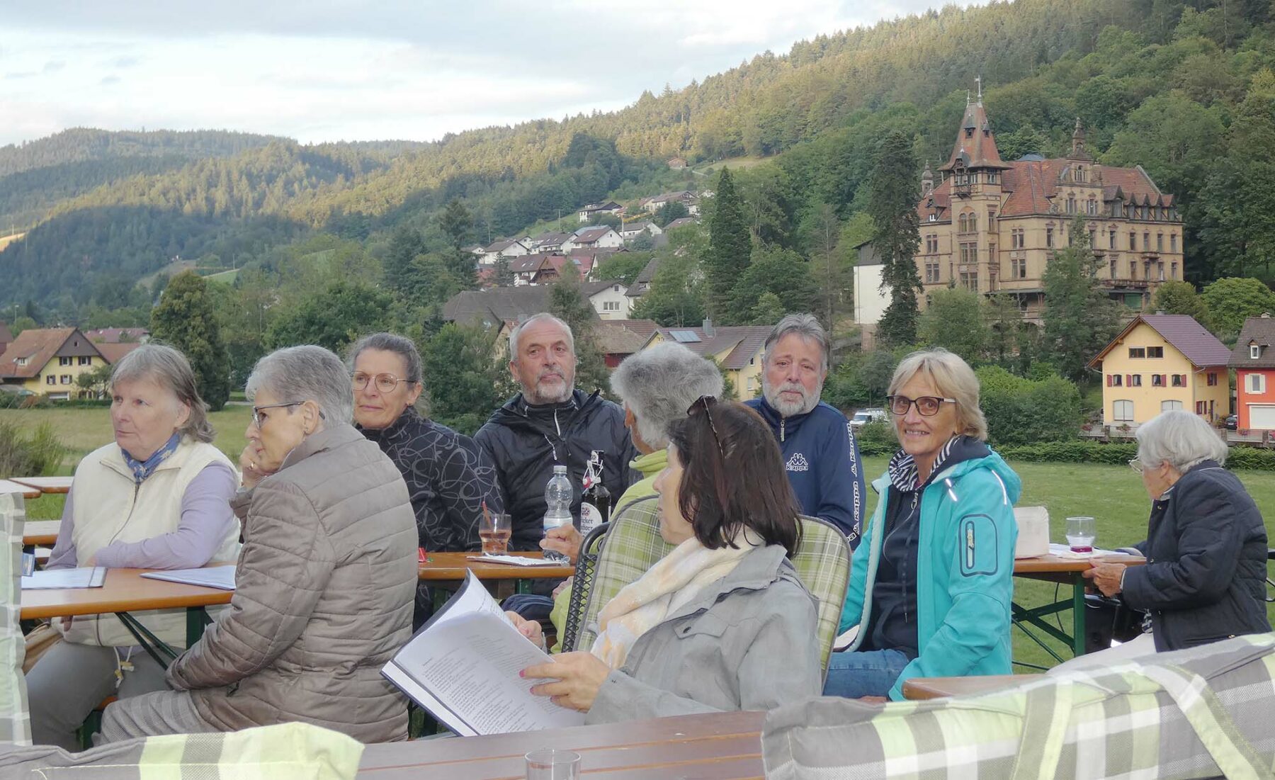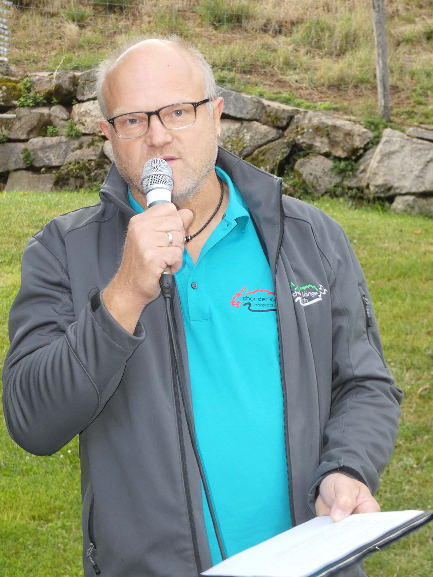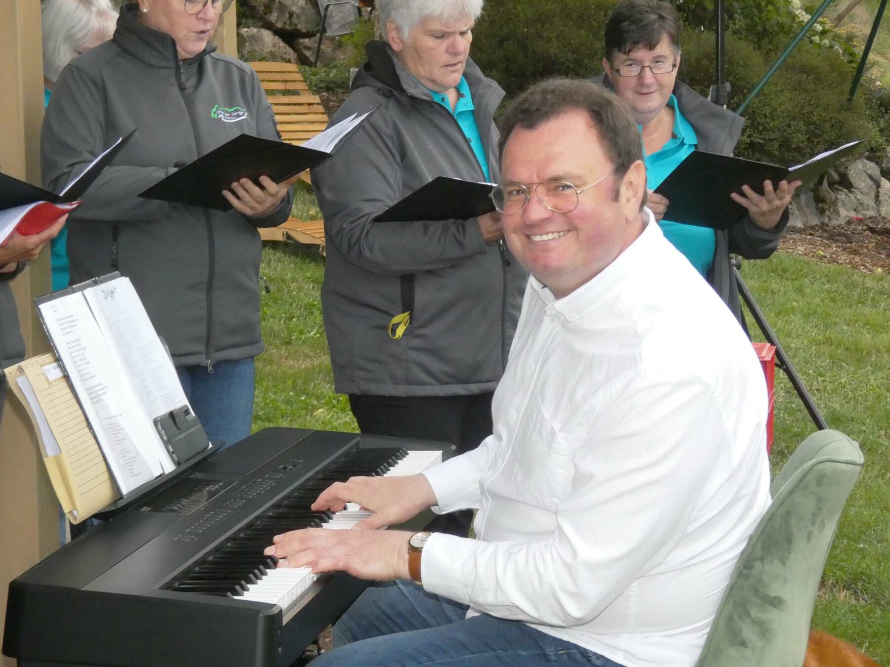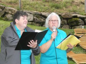 Obendrein kam auch die Optik nicht zu kurz: Erstmals trat der Chor der Klänge in Hemden auf, die in tiefem Smaragdblau strahlten. Dies alles vor einer wunderbaren Kulisse: Zum Tal hin ein beeindruckender Panoramablick, und zur anderen Seite hin das am Hang liegende und liebevoll mit Blumen geschmückte Ferienhaus der Familie Spitzmüller.