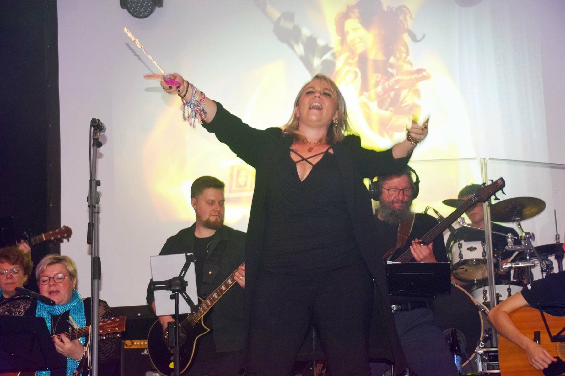Uwe Sonntag am Bass, Clemens Herrmann mit E-Gitarre, am Schlagzeug Felix Lehmann und Kjell Bogdahn und Eilina Schrempp am Keyboard sorgten für ein volles Klangerlebnis. Eine perfekte Ton- und Lichttechnik mischte die Lieder ab und setzte alle ins rechte Licht. Zu jedem Lied hatten zahlreiche Mitglieder auch passende und sehr originelle Video-Filmchen gedreht, die auf der Leinwand hinter den Aktiven zu sehen waren und oft für viel Heiterkeit sorgten.