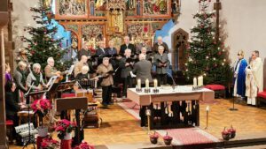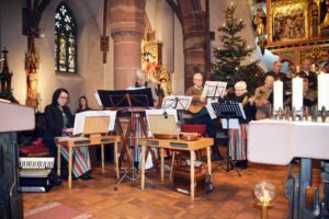 Es war in der Tat berührend, die Tiroler Volkslieder zu den Klängen der Stubenmusik zu hören. Zwar sind es nur elf Sänger des Wanderer Chors, die unter der Leitung von Peter Basler die Lieder sangen, doch sie konnten einmal mehr die Gottesdienstbesucher begeistern. Sie trugen die Lieder „Im Namen Gottes”, “O göttliche Liebe”, “Gott hat alles recht gemacht“ harmonisch, ruhig und getragen zum Lobe Gottes vor. Ein Höhepunkt war der „Andachtsjodler“, den sie sehr feinfühlig sangen. Die Mitglieder der Nordracher Stubenmusik – Luitgard Bieser, Antonia Haas, Susanne Hansmann, Martina Pfundstein und Georg Wimmer – begleiteten die Sänger auf ihren Saiteninstrumenten in idealer Weise. Sie spielten den „Weihnachtsboarischer“ und weitere traditionelle Stücke aus dem alpenländischen Raum.