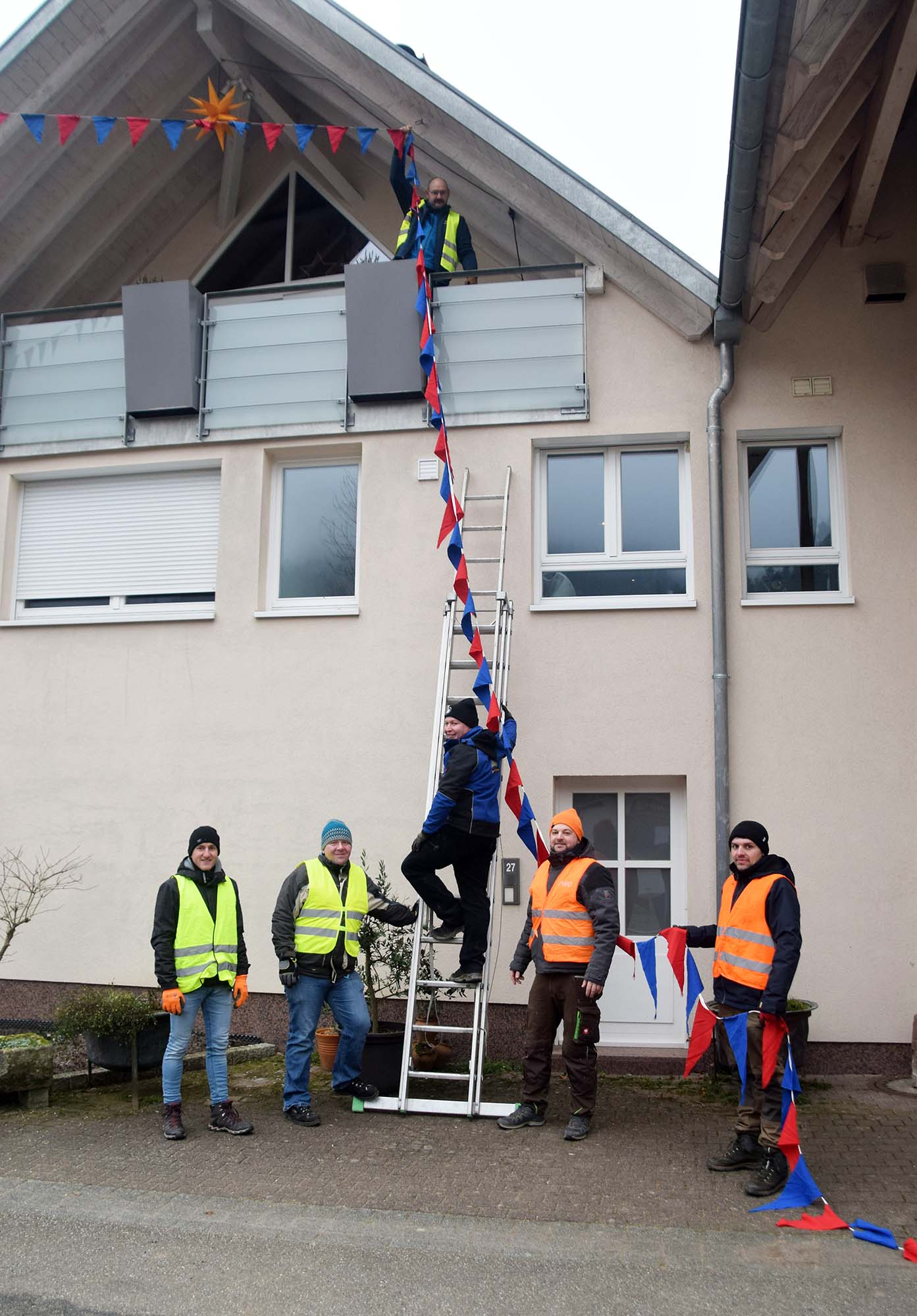 Ausgestattet mit Warnwesten, waren zahlreiche Zunft mitglieder in drei Teams im Einsatz. Sie befestigten an Straßenleuchten, Stangen und Gebäuden die ca. drei Kilometer lange Fasenddekora-tion.