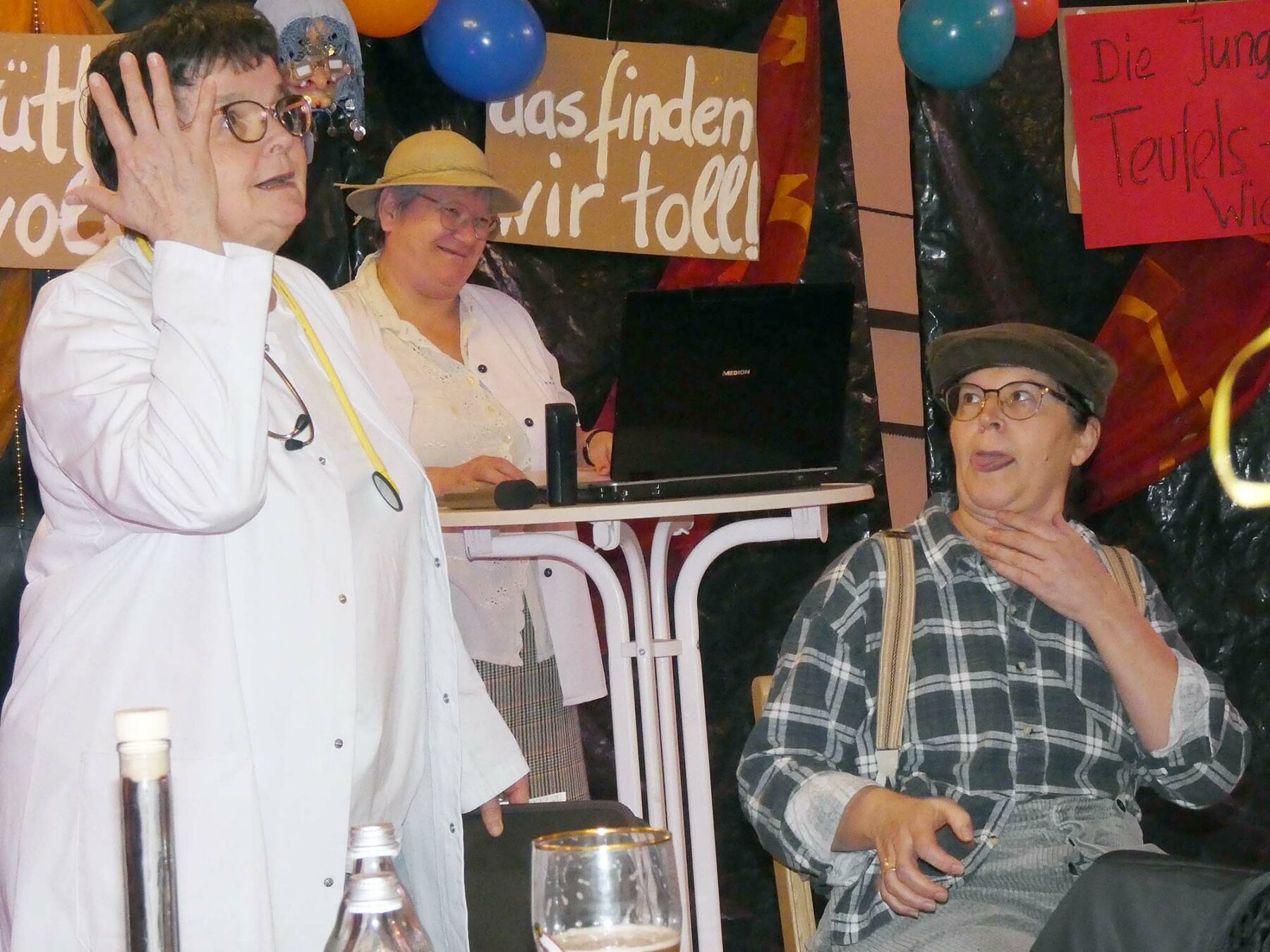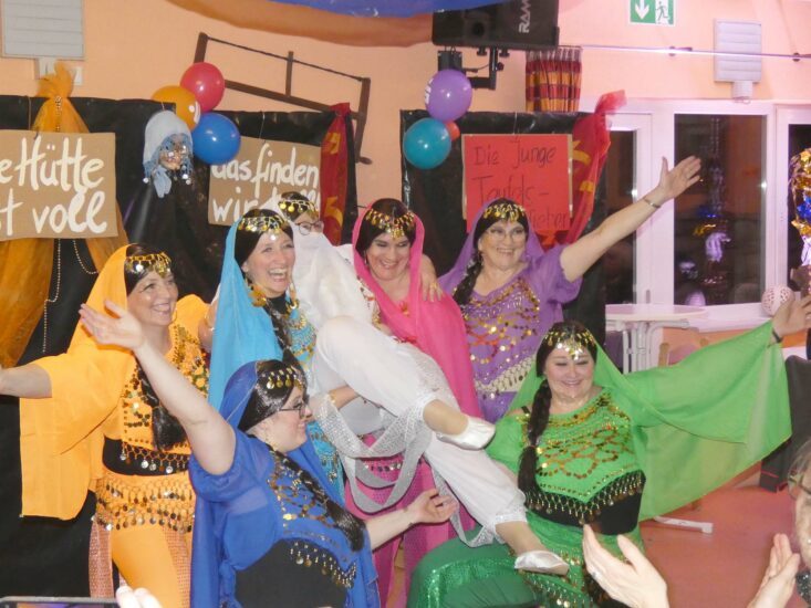 bestens rüber. Ebenso wie als Schnatterlärchen, die singend und mit Federstolen behangen dem weiblichen Klimakterium samt einer sich stetig verstärkenden Kraft der Erdanziehung trotzen. Zum Abschluss des vierstündigen Programmteils treten sie mit einem märchenhaft kostümierten Tanz aus 1001-Nacht auf und animieren erfolgreich zum Weiterfeiern.