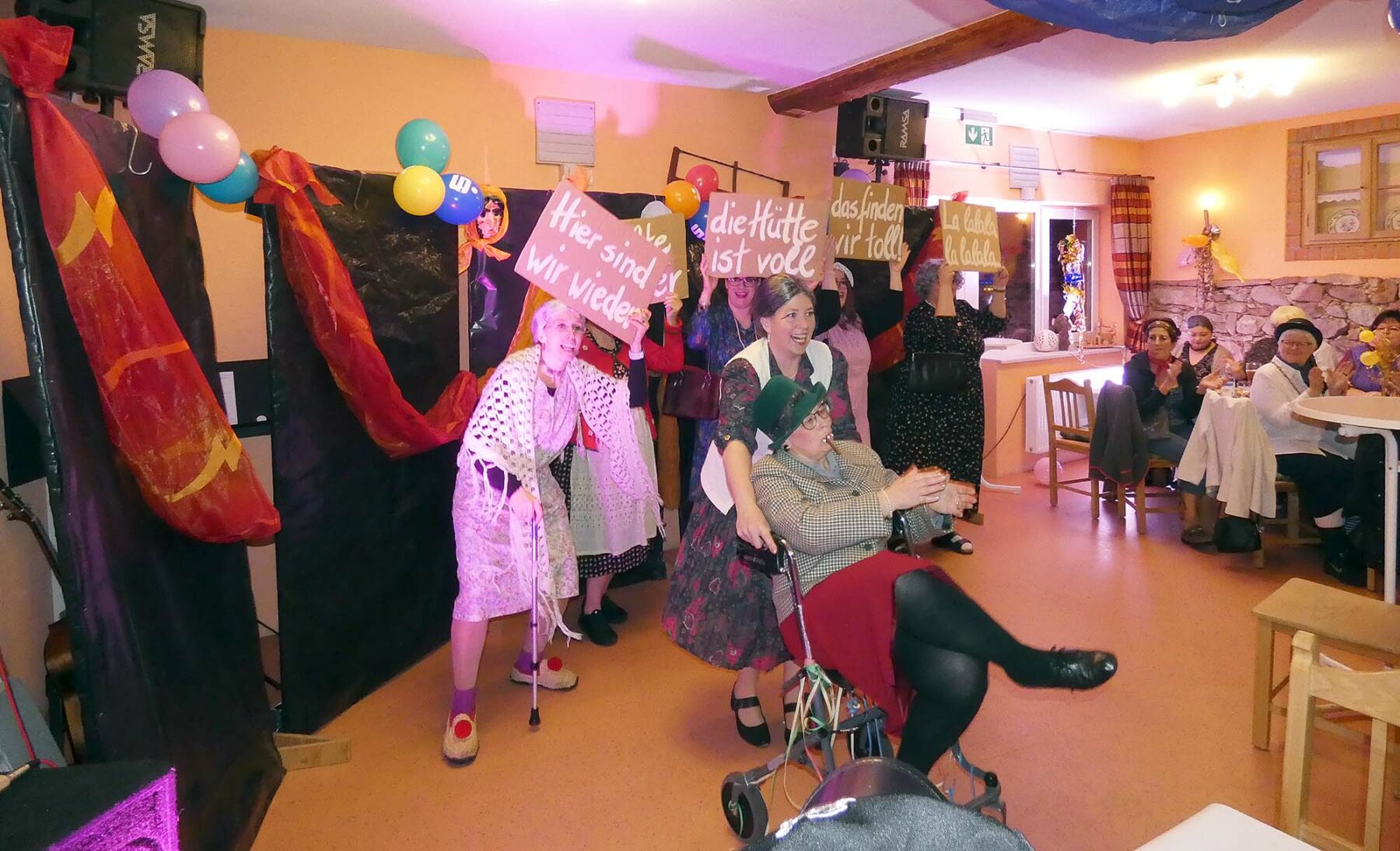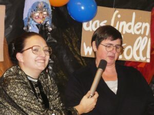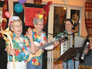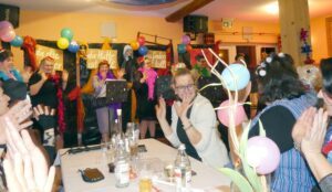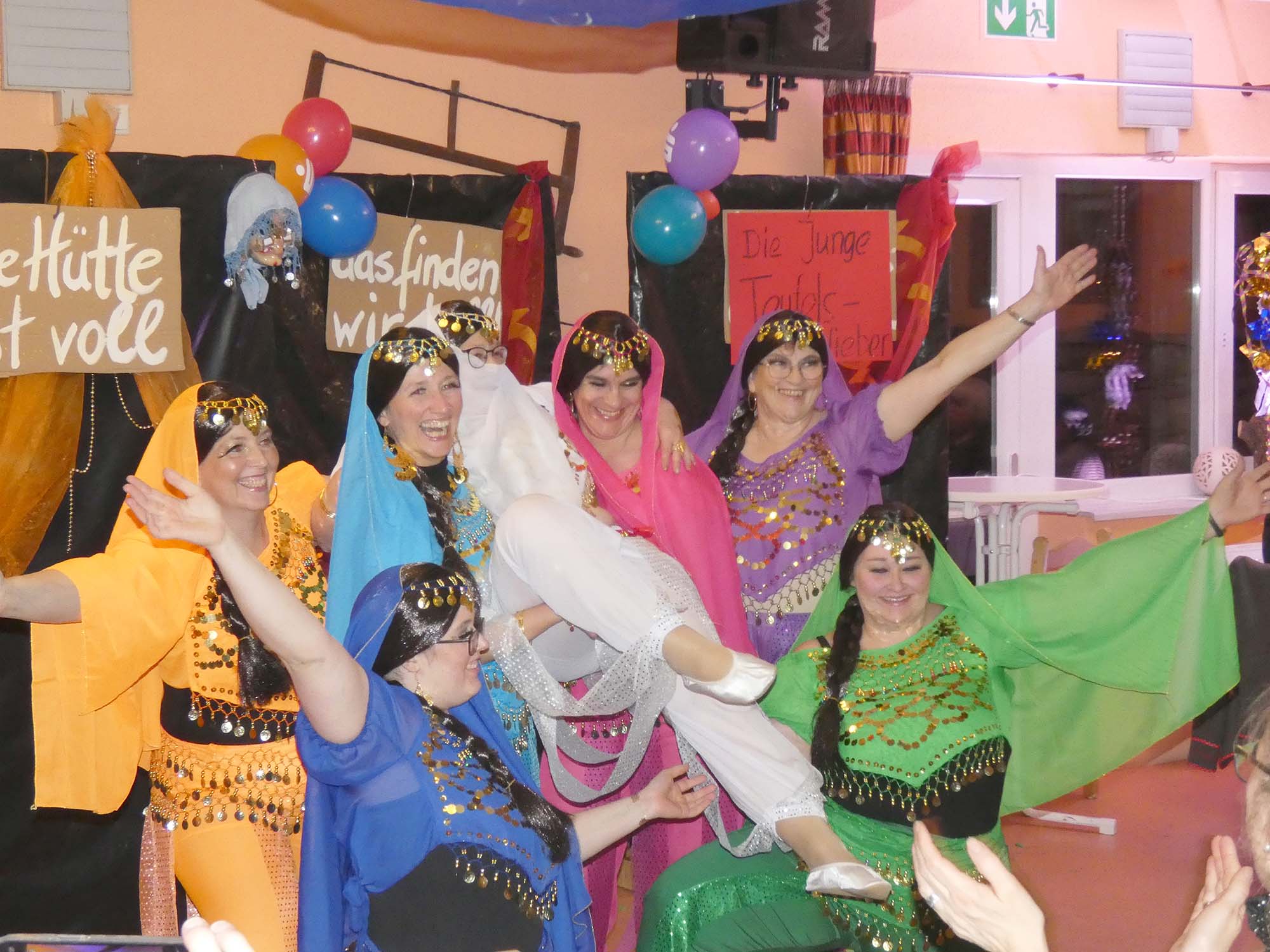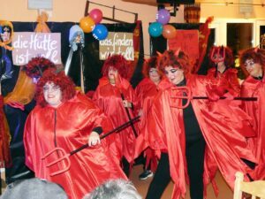 Sieben „junge“ Teufelswieber samt meterlanger Höllengabeln bringen mit ihrem anschließenden Tanz zu dem Schlager „Wir feiern wie noch nie“ auch gleich das Publikum in Bewegung. „Ihr dürft mal ´ne Runde schnattere, bis die nächsten