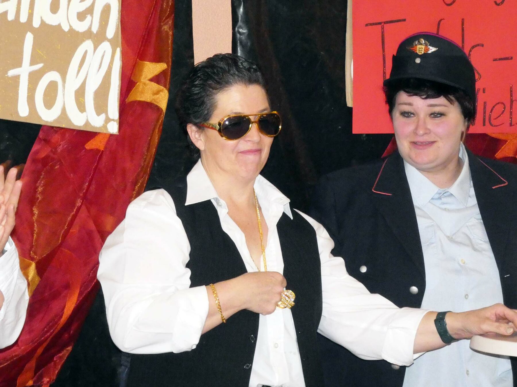 Für viel Gelächter auch sorgt eine enttäuschte Ehefrau, die mit gereimter Verve und doch erfolglos versucht, das Eheleben mit ihrem Friederich zu würzen. Und dann sind die Stehtischwieber an der Reihe. (Noch) züchtig in weißen Hemden und langen Spitzenhosen demonstrieren sie, wie überbordend gründlich und sittsam Frauen zu duschen pflegen. Bevor sie zur Darstellung des durchaus anders gearteten Duschvorgangs bei Männern übergehen, begeben sie sich zur Rückwand der Bühne. Hantieren verdächtig lange an sich herum, sorgsam vom Publikum abgewandt. Dasselbe beschleicht eine Ahnung. Die aber ist nichts im Vergleich zu dem dann voller Elan Präsentierten, definitiv nicht jugendfrei, aufgeklebtes Brusthaar ist da noch das Geringste. Mit der Fassung des Saales ist es vorbei. Er johlt und grölt, dass die umliegenden Berghänge wackeln.