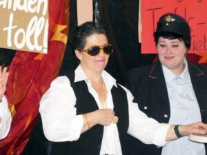 Zwischendurch legt die überaus wandlungsfähige Vollbesetzung der „Alde Wieber“ zwei weitere musikalisch-humorige Auftritte hin – auch als kernige Männer, die sich rund um Maite Kelly scharen, kommen sie