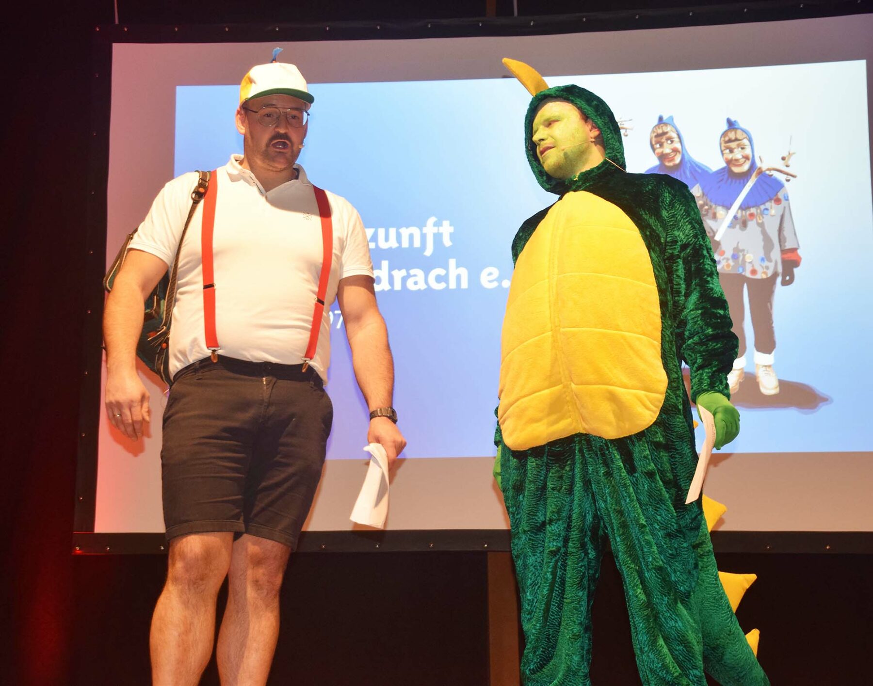 Am Nordracher Zunftabend sind sie eine Institution, „Dick und Doof“, seit Jahren von Josef Bruder und Björn Späth dargestellt. Nun gesellte sich auch noch „Dumm“ (Luis Lehmann) dazu. Sie spielten sich bei zwei Auftritten wieder gekonnt gegenseitig die Bälle zu und brachten manche Geschehnisse an den Tag. So gaben sie bekannt, dass der Flacke-Sepp Secondhand-Vegetarier geworden sei, denn „die Kuh frisst Gras und de Sepp die Kuh“. Aus Oberharmersbach sei der Vorschlag gekommen, das Kreisbürgerfest in Reichsbürgerfest umzubenennen. Im Nordracher Rathaus sei der Aufzug der Einzige, der in der Spur laufe.