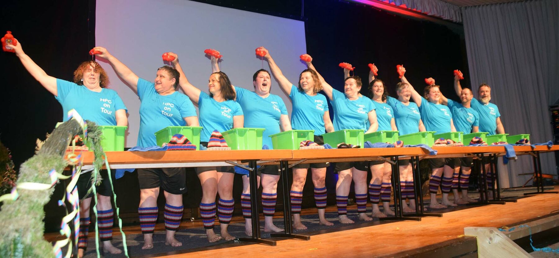 Dann kam der zweite Auftritt des HPC mit „synchronem Haarewaschen“. Jedes Mitglied tauchte in Reih und Glied zunächst seinen Kopf in eine wassergefüllte Wanne und trug dann beim jeweiligen Nachbarn Shampoo auf, um schließlich wieder alles abzuwaschen, eine Mords-Gaudi!