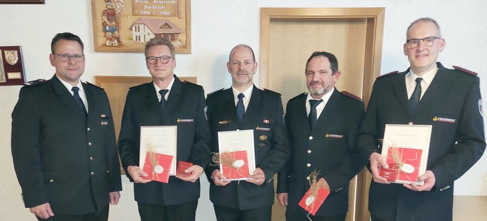 Kommandant Heiko Spinner mit einigen der geehrten Feuerwehrleute der Nordracher Feuerwehr. Von links nach rechts: Rolf Braun, Thomas Decker, Wolfram Welle und Günter Schwarz. Foto: Feuerwehr