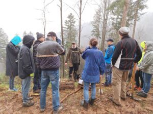 Zum Pflanzen ging es in steiles und auch steiniges Terrain unterhalb des Gebiets „Flacken“. Dort erklärte der Revierforster die einzelnen Schritte. Zunächst galt es ein großes Loch zu schaufeln und dabei zu schauen, dass es nicht gerade über einem Felsen sitzt.