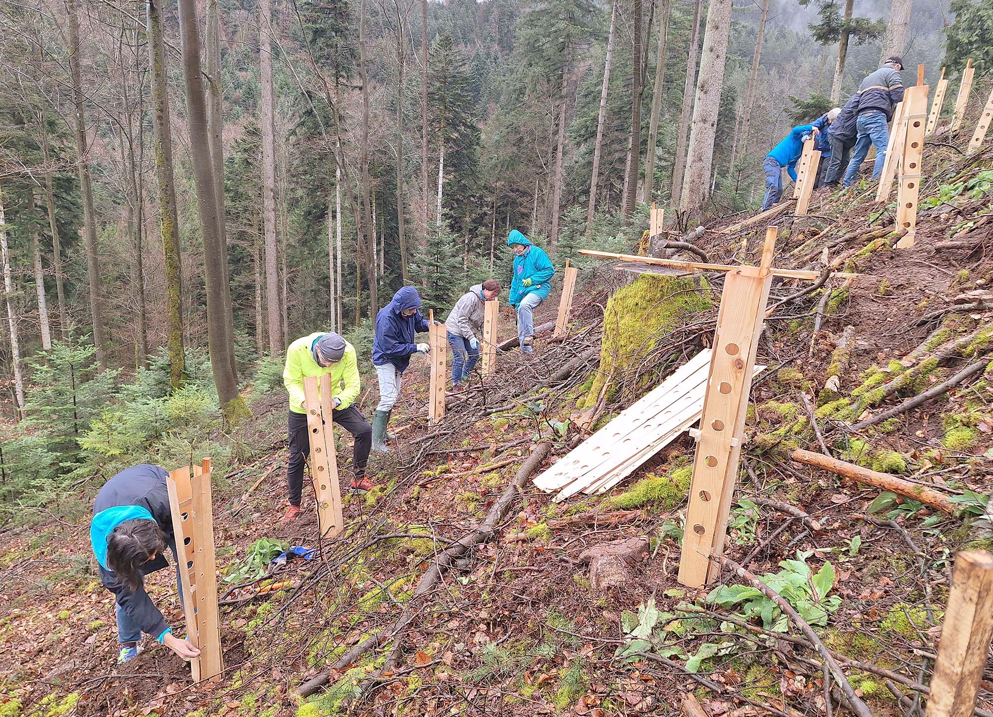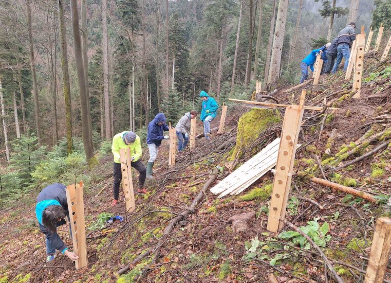 Hüllen aus Plastik wären zwar preiswerter gewesen. Zudem haben sie den Vorteil, dass sich Kondenswasser bildet, am Kunststoff herunterläuft und somit für eine zusätzliche Bewässerung der Jungpflanze sorgt. Dieses Plastik aber hätte in einigen Jahren dann aus dem Wald entsorgt werden müssen.