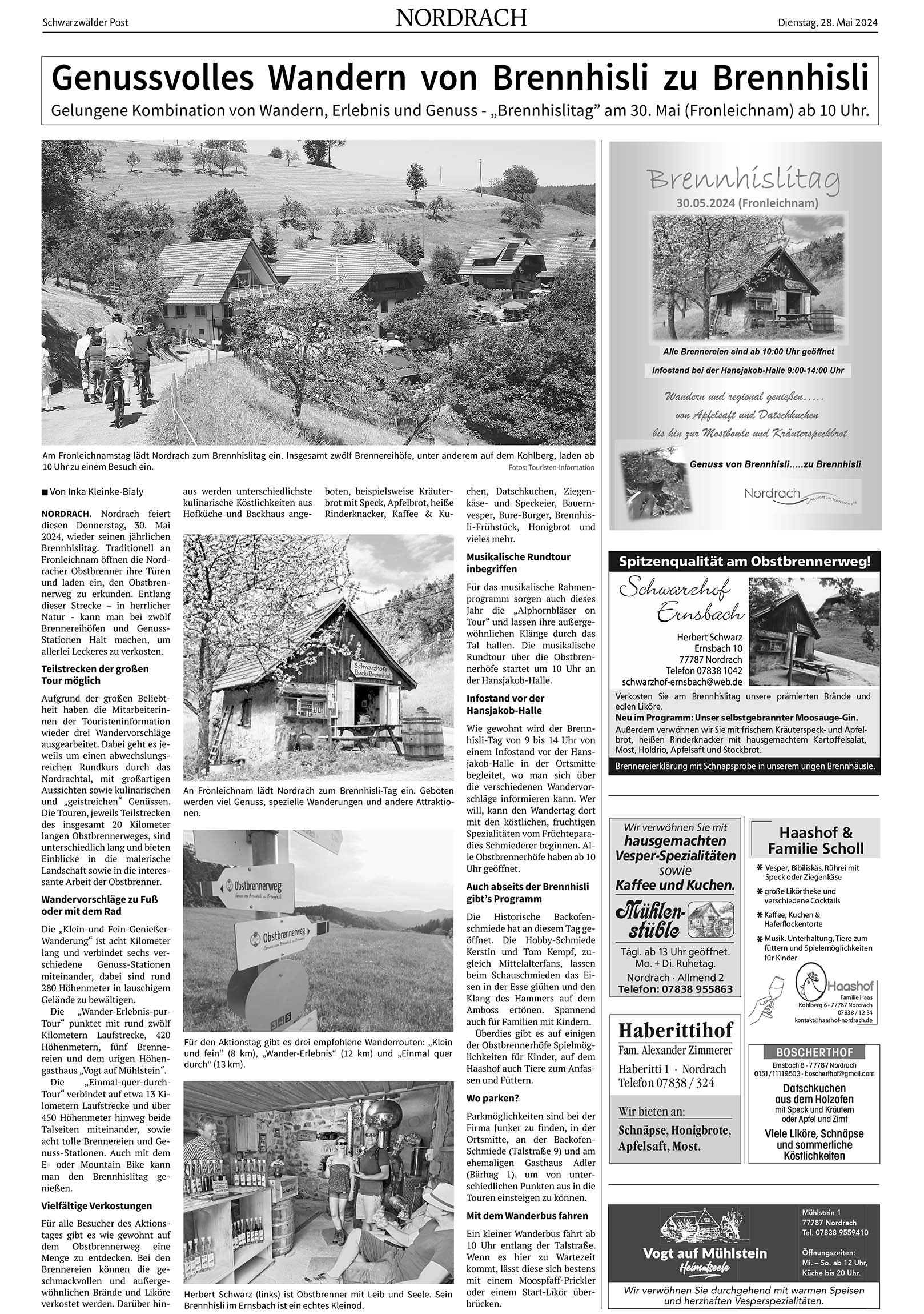 Nordrach | 28.05.2024 Genussvolles Wandern von Brennhisli zu Brennhisli Foto:Am Fronleichnamstag lädt Nordrach zum Brennhislitag ein. Insgesamt zwölf Brennereihöfe, unter anderem auf dem Kohlberg, laden ab 10 Uhr zu einem Besuch ein. Foto: Touristen-Information von Inka Kleinke-BialyGelungene Kombination von Wandern, Erlebnis und Genuss – „Brennhislitag” am 30. Mai (Fronleichnam) ab 10 Uhr. Foto: Touristen-InfoDas könnte Sie auch interessieren:Foto: Touristen-Info NordrachWeihnachtszauber 2025 in NordrachFoto: VereinNordrach rockt den Europa-ParkFoto: Archivfoto: Inka Kleinke-BialyBiberacher Weihnachtsmarkt lädt zum…