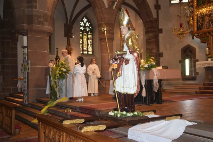 Böllerschüsse kündigten den Festtag an. Um 9:15 Uhr riefen die Glocken die Gläubigen zum Festgottesdienst. Pater Irenäus schilderte in seiner Predigt das Leben des Kirchenpatrons. Im Gespräch mit den Erstkommunikanten fragte er sie, ob sie Christiano Ronaldo und Jamal Musiala kennen würden.