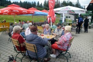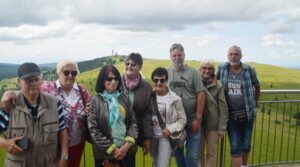 Die Anfahrt erfolgte durch das Kinzig- und Gutachtal, über Triberg, Furtwangen und auf der B500 weiter, dann durch das Jostal nach Neustadt, Titisee bis zum Feldbergparkplatz. Wer wollte, konnte sich hier zunächst mit Kaffee und Kuchen stärken. Dann trug die 8er-Kabinenbahn die Senioren hoch zum Seebuck auf 1.450 m. Vom Bismarckdenkmal aus konnte man den tief liegenden Feldsee und weiter bis zu den Bergen des Nordschwarzwalds sehen. Dann lockte der ca. 40 m hohe Feldbergturm, dessen Aussichts plattform mit einem Aufzug oder durch das Treppenhaus erreichbar ist. Das Rundum- Panorama von hier oben war großartig.