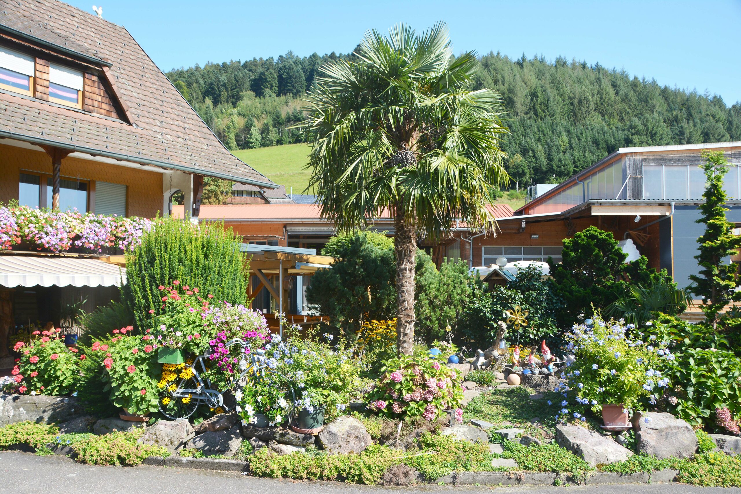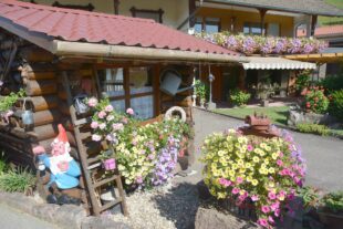 Die Blütenpracht entlang des Balkons ist überbordend. Im Vorgarten bilden Stauden, Blütenpflanzen, Büsche und eine Hanfpflanze harmonische Einheit. Auch einige muntere Gartenzwerge grüßen aus dem Vorgarten und ein himmelblau