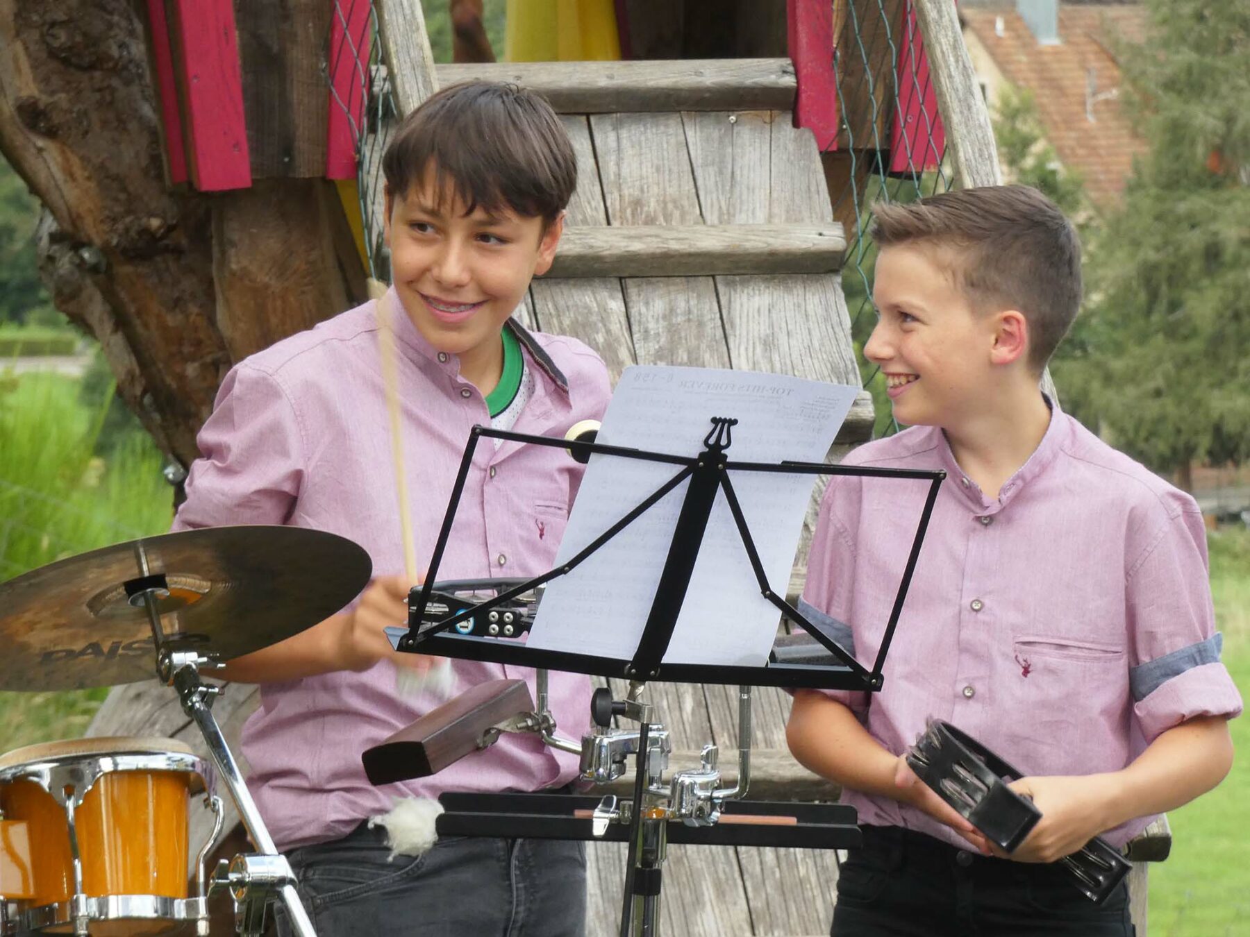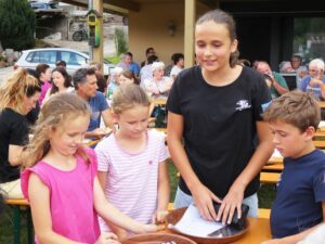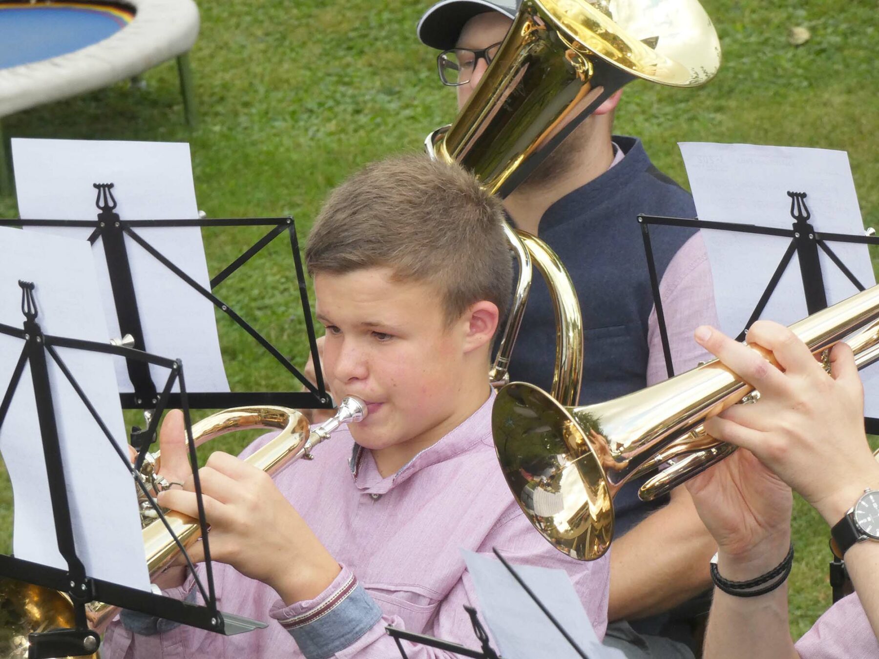 Froh über das nun endlich erfolgte Einsehen des Wettergottes zeigen sich auch Gertrud und Herbert Spitzmüller, die Betreiber des Hermehansenhofs. Sie haben die große Wiese vor ihrem Ferienhaus für das Platzkonzert zur Verfügung gestellt – von hier oben, auf halber Hanghöhe, hat man einen wundervollen Blick hinunter ins Dorf und weit hinein ins Tal. Auch der zum Hof gehörende Bewirtungswagen ist im Einsatz. Hier werden leckere Flammkuchen und Bratwürste gebrutzelt, nicht weniger willige Abnehmer finden die kühlen Getränke an diesem warmen Sommerabend.