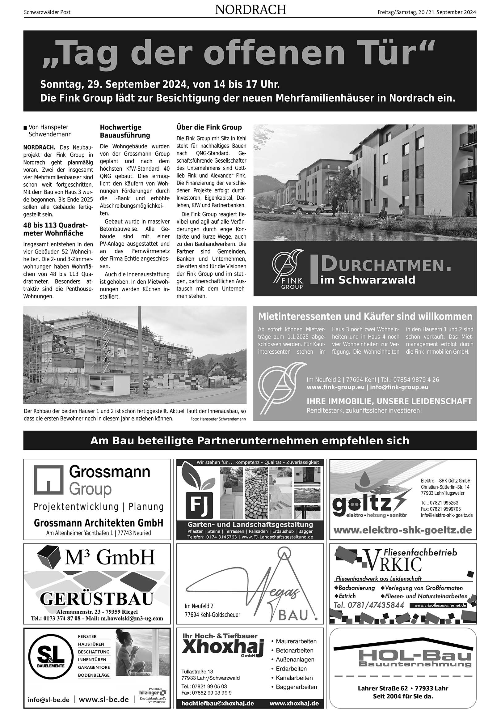 Nordrach | 20.09.2024 „Tag der offenen Tür“ Foto: Foto: Unternehmen von Hanspeter SchwendemannSonntag, 29. September 2024, von 14 bis 17 Uhr. Die Fink Group lädt zur Besichtigung der neuen Mehrfamilienhäuser in Nordrach ein. Foto: UnternehmenDas könnte Sie auch interessieren:SKC Nordrach 1 siegt im KellerduellFoto: Touristen-Info NordrachWeihnachtszauber 2025 in NordrachFoto: VereinNordrach rockt den Europa-Park