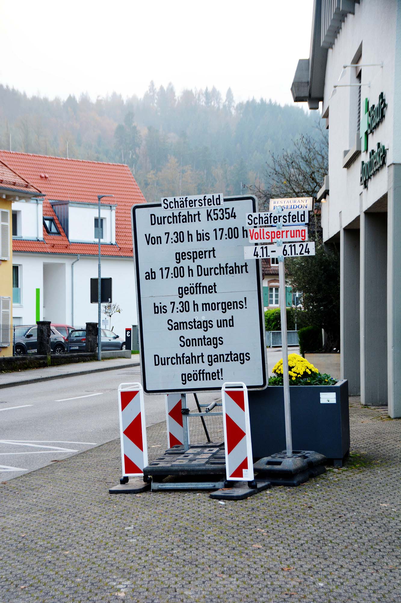 In Nordrach finden ab Montag, den 4. November, Deckenerneuerungsmaßnahmen unter Vollsperrung nach der „Kolonie 32“ bis zur „Kleinen Aussicht“ statt.