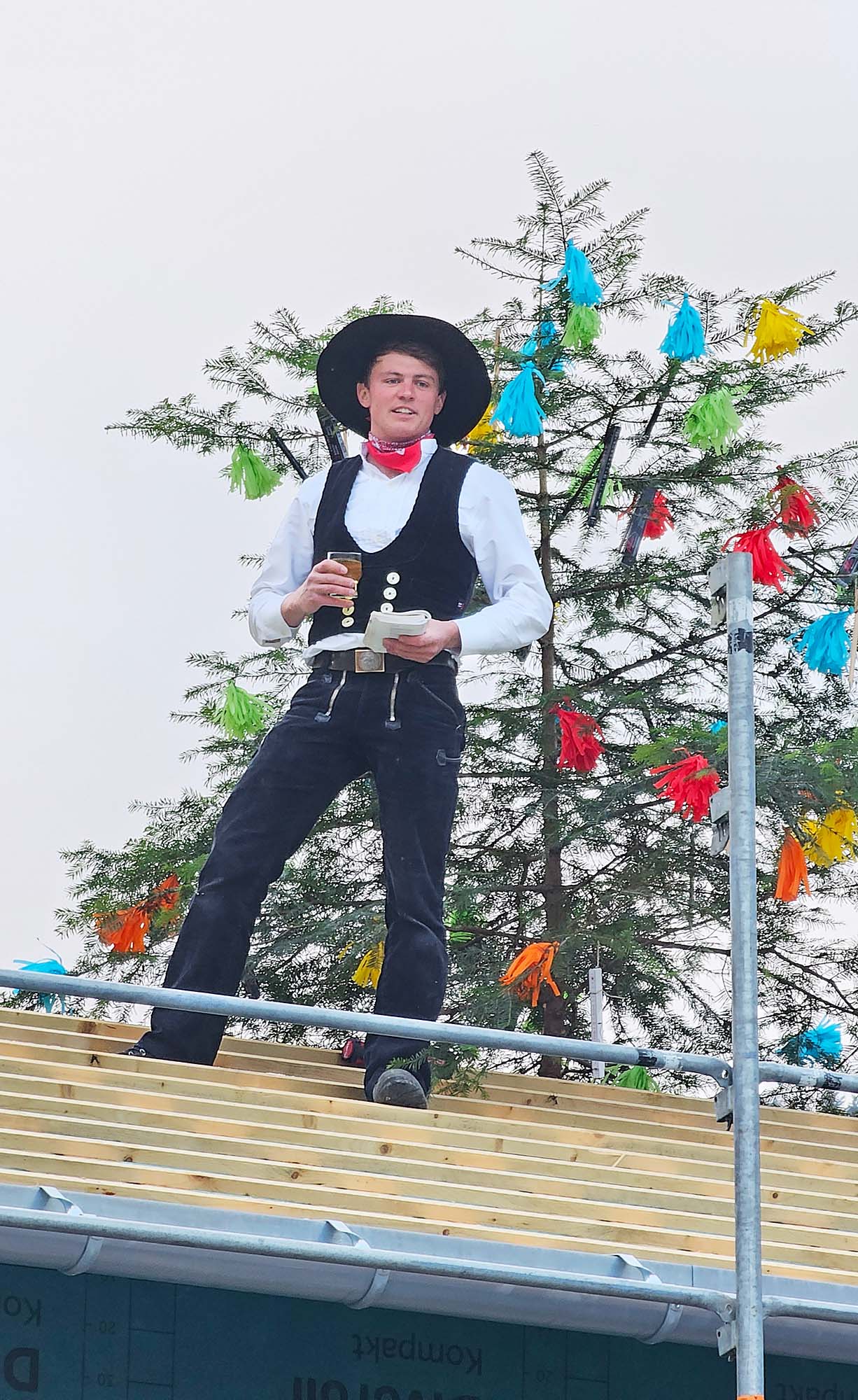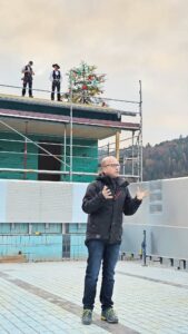 Der Schwimmbadverein ist zwischenzeitlich einer der größten Vereine im Ort und auf fast 300 Mitglieder angewachsen. Diese freuen sich schon auf das Frühjahr und die kommende Badesaison mit der geplanten Eröffnung. „Man wird hier Glück und Spaß haben. Im kühlen Nass, beim langen Baden. Dem Schwimmbad wünsch ich jetzt den Segen, den unser Herrgott möge geben; vor Unheil, Blitz und Donnerschlag mög‘ er bewahren dieses Bad! Und nun ist meine Rede aus, wir gehen jetzt zum Richtfestschmaus. Zum Schluss trink ich mein Glas noch leer, zum Wohl dem Verein und Gott zur Ehr‘!“ Das Ende des Richtspruchs, zusammen mit der punktgenau von den beiden Zimmermännern auf dem Dach geleerten Flasche Wein, ein zersplittertes Glas und ein herzlicher Applaus der Gäste leitete über zum geselligen Teil des Richtfests. In der ASV-Halle neben dem Schwimmbad wurde gemeinsam gefachsimpelt und über die nächsten Arbeitsschritte gesprochen. Tags darauf am Samstag ging es an das Decken des Daches. Das Gebäude erhält in Kürze seine Holzfassade und sobald die Edelstahlwände und die Leitungen im Becken angeschlossen sind eine Bodenplatte, auf der dann der Edelstahlboden aufgelegt wird. Bis zum Jahresende bietet der Schwimmbadverein noch eine Vergünstigung der Mitgliedsbeiträge an. Weitere Mitglieder sind natürlich herzlich willkommen!