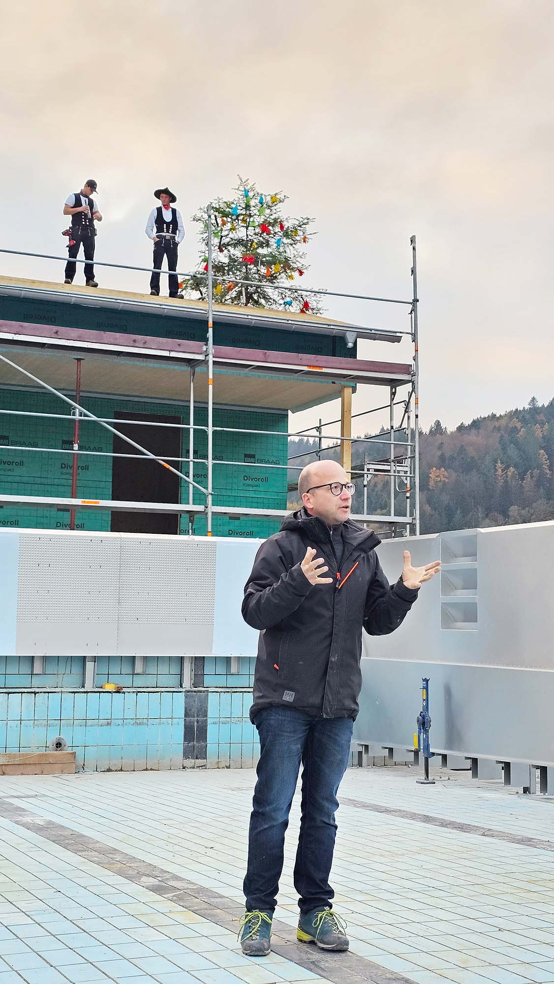 Dank der Millionenspende des im Sommer verstorbenen Ehrenbürgers und Fabrikanten Erwin Junker schreiten die Arbeiten am Nordracher Schwimmbad gut voran: Am Freitag wurde Richtfest gefeiert.