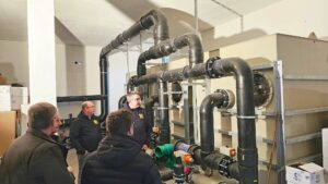 Foto: Oliver VollmerDer Schwimmbadverein feierte am Freitag mit den Handwerkern, Planern und Vereinshelfern das Richtfest des neuen Technikgebäudes. „Schaut nur, wie sich heut alles freut! Warum das? – Ja, wir sind so weit, dass unser Werk – ihr dürft uns loben –schon seinen Dachstuhl hat erhoben, so dass wir nach dem Brauch, dem alten, jetzt können unser Richtfest halten.“ So begann Jannik Kinast von der ortsansässigen Firma Holzbau Bendler seinen Richtspruch. Die gut 60 Gäste versammelten sich „im noch trockenen Becken“ und überzeugten sich von dort aus von der Qualität des gebauten Dachstuhls. Einige Tage zuvor begann zudem die Montage der Edelstahl-Beckenwände. Im Technikgebäude sind bereits große Teile der Schwimmbadtechnik installiert. Viele Tonnen Aushub wurden bereits bewegt und altes Abbruchmaterial für den Wiedereinbau geschreddert. Planer und Handwerker waren sich mit Jannik Kinast einig: „Dem Verein jetzt ein Lebe hoch, mein Schluck bekräftigt dieses noch! Und Dank sei ihnen noch gesagt, dass sie so mutig es gewagt! Hoch! Hoch! Hoch!“