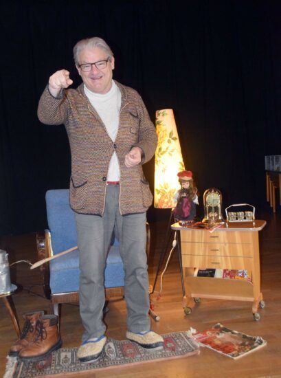 Im Mittelpunkt des Nachmittags stand der Vortrag von Elmar Langenbacher. Er hatte dafür eine Menge Accessoires mitgebracht, darunter Oma sessel, Stehlampe, Milchkanne, Teppichklopfer, Strohschuhe, Hahn- und Henne-Tasse, Trachtenpuppe, Gurkengläser und vieles andere mehr.