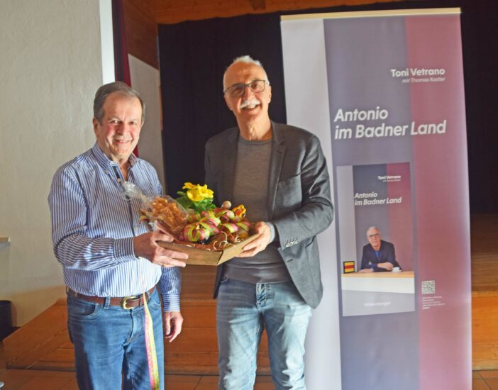 Im Mittelpunkt des Nachmittags stand der Vortrag von Toni Vetrano. Er war der erste Oberbürgermeister in Baden-Württemberg, der im Ausland geboren war. Er schilderte seine beeindruckende Lebensgeschichte und seine Sicht auf Migration und Integration in seinem Buch „Antonio im Badner Land“. Zum „Verschriftlichen seiner Gedanken“ fand er dazu die Unterstützung von Thomas Kastler.