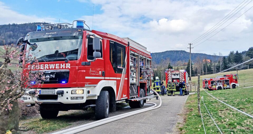 Es ist immer wieder wichtig Übungen auch im Außenbereich, wo keine öffentliche Wasserversorgung vorhanden ist, durchzuführen. So fiel die Wahl zur diesjährigen Frühjahrshauptübung auf das Wohnhaus von Bernd und Heidi Kern am Bärhag, oberhalb des Sägewerks Echtle. Sehr realitätsnah vorbereitet hatten die Übung stellvertretender Kommandant Manuel Nepple und Gruppenführer Johannes Schnurr.