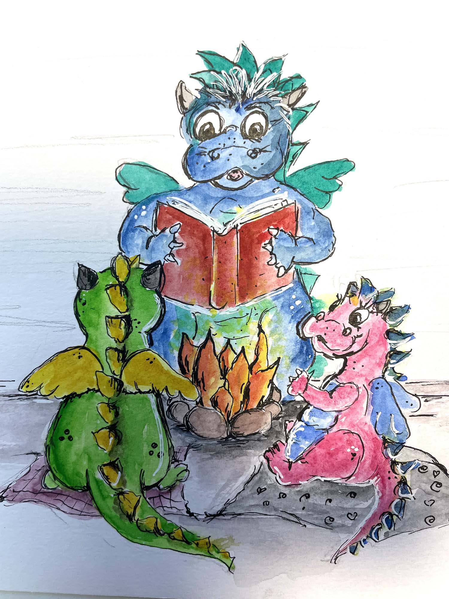 Angefangen hat die Geschichte schon im tiefen Winter: „… Auch in der Höhle von Lilli und NorDi war es ruhiger geworden. Die Drachen ruhen sich in den kalten Monaten gerne aus, sitzen gemeinsam um ihr gemütliches, warmes Feuer und erzählen sich Geschichten aus der eigenen Drachenfamilie oder auch von fremden Ländern.