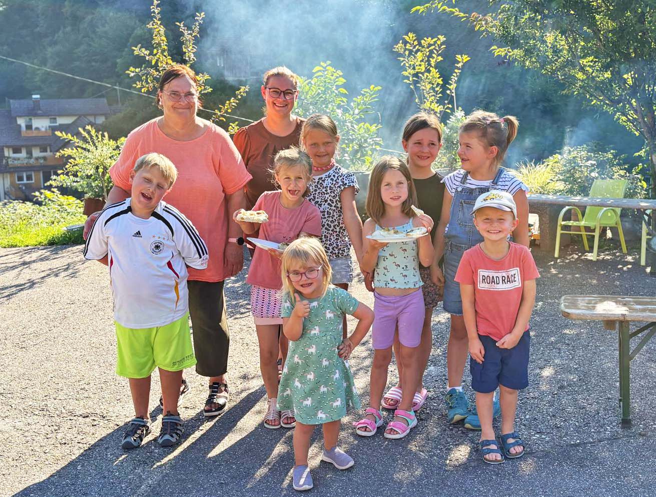 Im Rahmen des Nordracher Sommerferienprogramms wurde die Sommerküche bei Ingrid Decker zum Treffpunkt für kleine Nachwuchsbäcker. Unter fachkundiger Anleitung durften die acht teilnehmenden Kinder selbst Hand anlegen: Teig kneten, Tomaten und Wildkräuter schneiden und mit Begeisterung drei Varianten des traditionellen Datschkuchens zubereiten.
