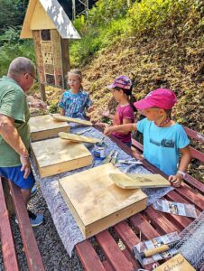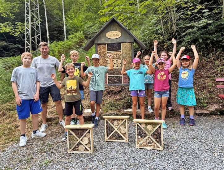 Im Rahmen des Nordracher Kinderferienprogramms erhielt das Projekt eine besondere Erweiterung: Acht Kinder bauten gemeinsam mit Helferinnen und Helfern der DAV-Ortsgruppe jeweils ein eigenes kleines Insektenhotel. Die fertigen Werke durften am Ende stolz mit nach Hause genommen werden. Vor dem praktischen Teil gab es eine kindgerechte Einführung in die heimische Insektenwelt – von verschiedenen Arten über ihre Lebensweise bis hin zu ihrem ökologischen Nutzen.