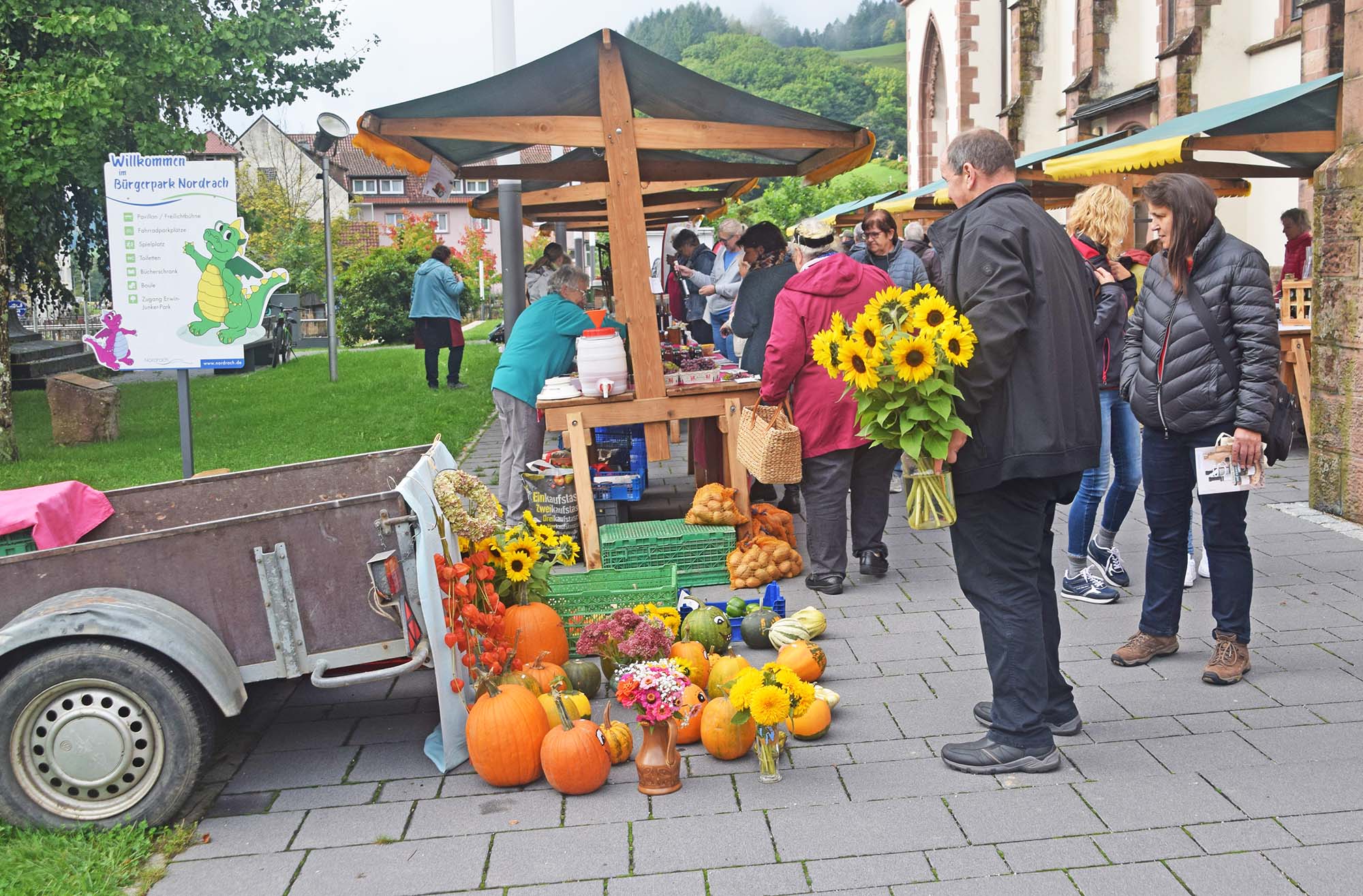 An elf Marktständen boten die Landfrauen am Samstag gemeinsam mit weiteren Anbietern eine große Auswahl regionaler Produkte an: frisch gebackenes Bauernbrot, Kartoffeln, Gemüse, Früchte, neuer Wein, Honig, Fruchtaufstriche, Käse, Schinken, Wurstwaren, Gewürze sowie Schnäpse und Liköre.