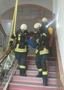 Sobald klar war, dass sich noch Personen im Gebäude befinden, rückten die Atemschutztrupps beider Wehren zur Menschenrettung vor. Vor dem Haupteingang erhielten die Teams ihre Einsatzaufträge, dann ging es mit Schlauchleitungen und Funkverbindung in das weitläufige Treppenhaus. Die Größe und verwinkelte Struktur des Gebäudes machten die Orientierung schwierig – ein deutlicher Unterschied zu Einsätzen in gewöhnlichen Wohnhäusern. Während sich die Trupps systematisch Stockwerk für Stockwerk vorarbeiteten, wurden mehrere Schlauchleitungen als Sicherung und für eine mögliche Brandbekämpfung verlegt. Da der Luftvorrat in den Atemschutzgeräten auf rund 30 Minuten begrenzt ist, musste der Einsatz genau koordiniert werden. Nach kurzer Zeit gelang es, die verletzten Personen aufzufinden und über das Treppenhaus ins Freie zu bringen, wo sie vom DRK übernommen wurden. Gleichzeitig öffneten weitere Einsatzkräfte Abluftöffnungen, sodass mit zwei Überdrucklüftern Rauch und Brandgase aus dem Gebäude gedrückt werden konnten.