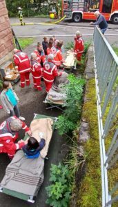 Auch das Rote Kreuz war stark eingebunden. Unter Leitung von Bianca Schilli richtete das DRK eine Sammelstelle für Verletzte ein, an der sie erstversorgt und für den Transport vorbereitet wurden. Mitglieder des Jugendrotkreuzes halfen bei der Registrierung mit. Besonders realistisch wirkten die täuschend echten Verletzungen, geschminkt vom DRK-Team um Vivien Müller.
