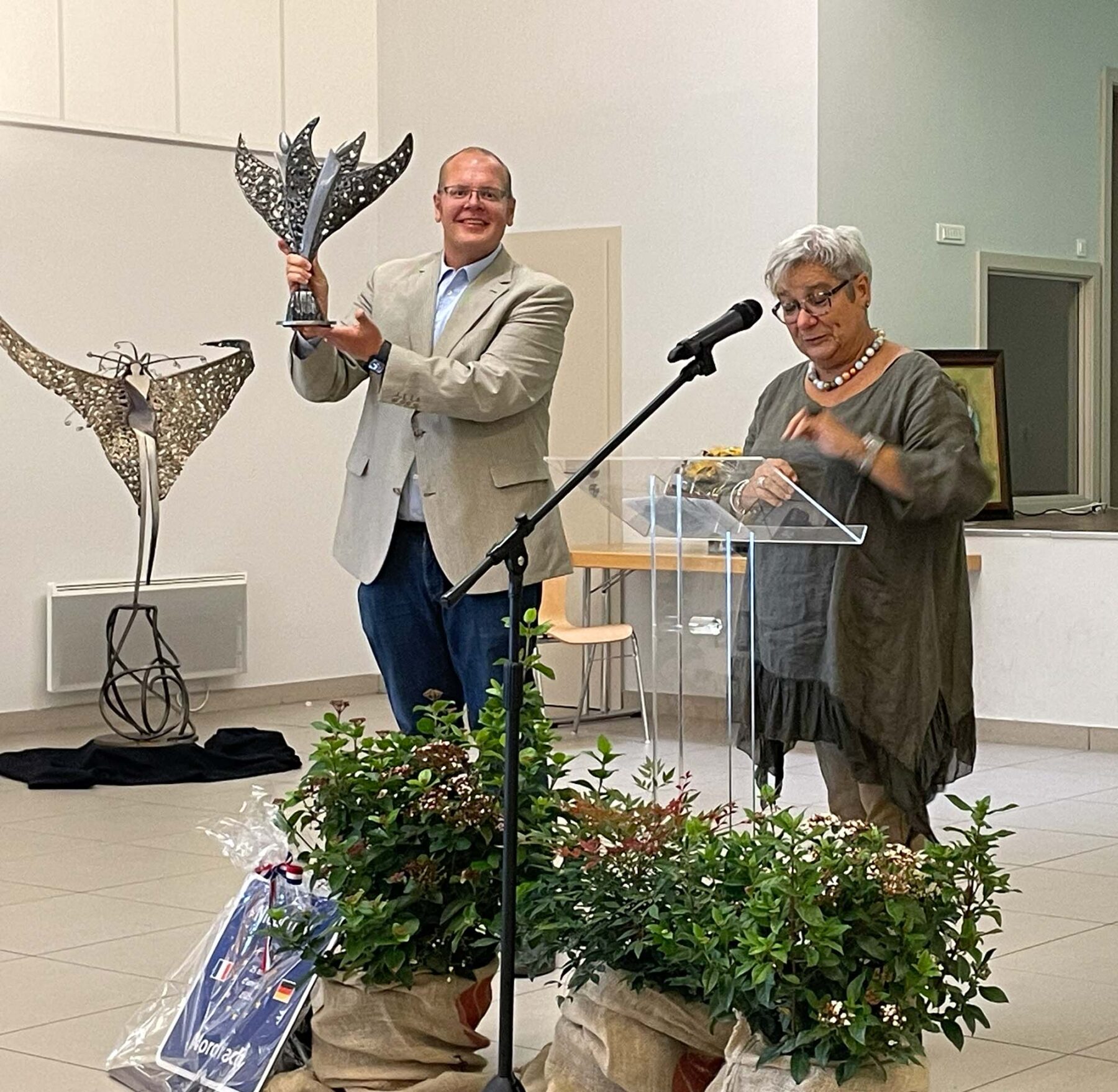 Auch die Gastgeschenke unterstrichen diesen Gedanken: Nordrach überreichte Niedernai ein neues Schild, das die Partnerschaft beider Gemeinden im europäischen Kontext darstellt. Im Gegenzug schenkte Niedernai eine Skulptur eines örtlichen Künstlers. Es zeigt zwei sich gegenseitig stützende Engel auf einem gemeinsamen Fundament. Das Kunstwerk symbolisiert das gegenseitige Vertrauen und die enge Verbundenheit beider Orte.