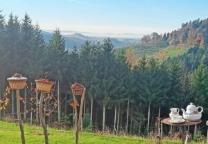 Weiter ging’s nun immer leicht bergauf- und ab, bevor an der Wassertretstelle eine längere Vesperpause eingelegt wurde. Gestärkt – natürlich auch mit mitgebrachten Likören von Brigitta und Luitgard – folgte die Gruppe dem Panoramaweg bei immer wieder begeisternden Blicken, unter anderem auch zum Moosturm, um wiederum bei einer liebevoll dekorierten und bestens ausgestatteten Raststation Halt zu machen. Diese Station gehörte nun wieder zum Hexensteig, der ab hier wieder parallel zum Panoramaweg verlief.