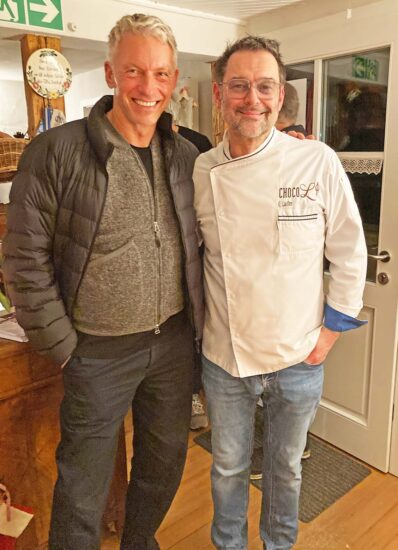 Als „Dankeschön“ an Olaf Hajek hat Chocolatier und Koch Egbert Laifer den Künstler mit Freunden ins Blaue Hus nach Nordrach eingeladen. Das Originalmotiv „Unterwegs zum Paradies“ ist noch bis zum 6. Januar 2026 im Adventskalenderhaus in Gengenbach zu sehen.