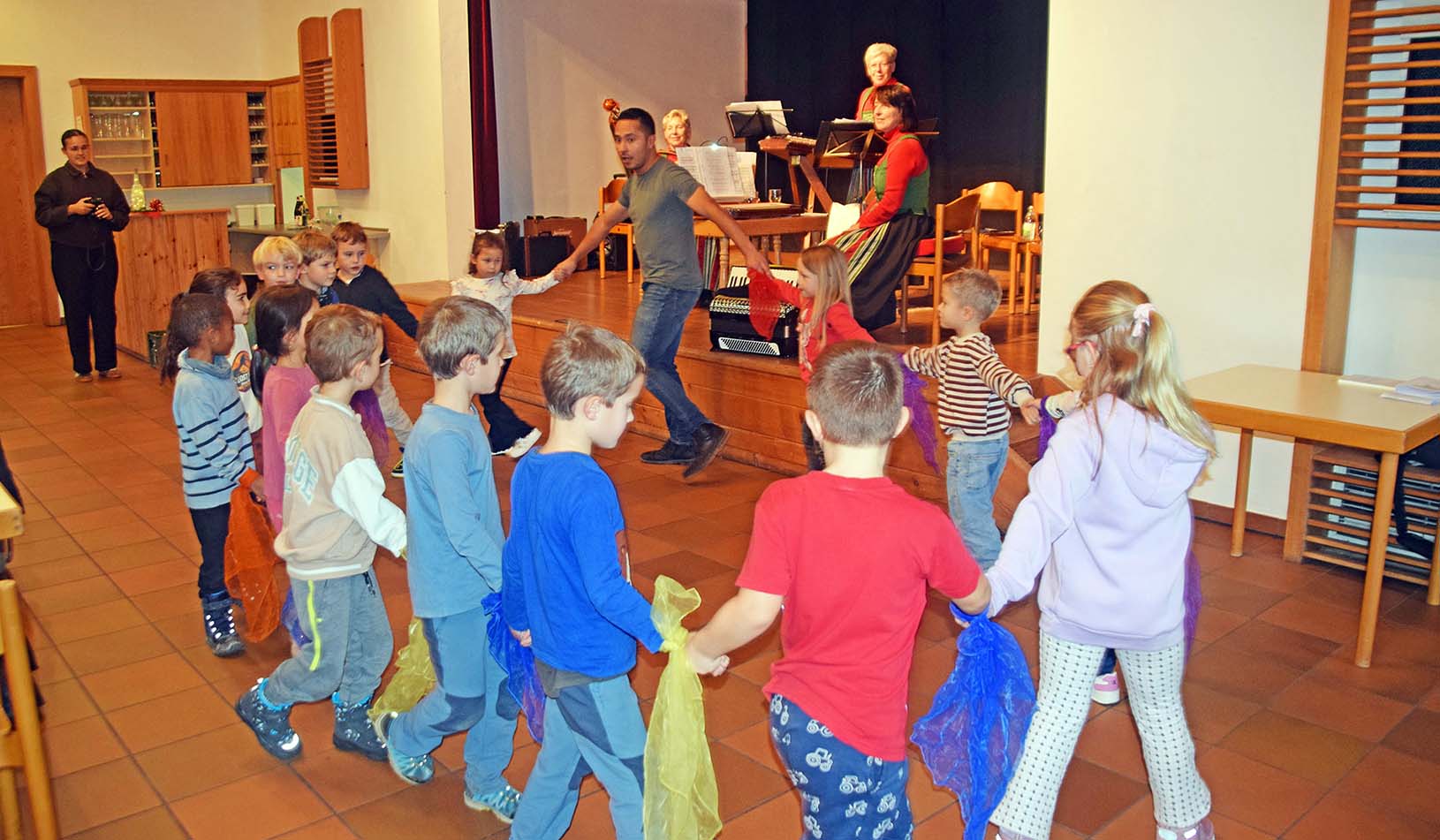 Stubenmusik verbreitet mit Spiel und Gesang adventliche Stimmung. Kindergarten-Kinder begeistern mit ihrem „Schneeflocken-Tanz“.
