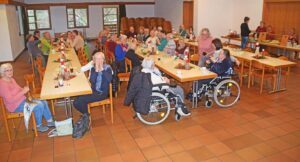 35 Seniorinnen und Senioren waren ins Bürgerhaus gekommen. Die Frauengemeinschaft hatte die Tische weihnachtlich geschmückt und bewirtete die Gäste zunächst mit Kaffee und selbstgebackenen Kuchen.