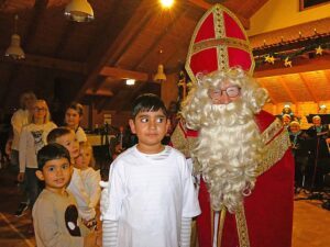 Den ganz kleinen unter ihnen war der große Mann naturgemäß nicht immer geheuer. Ein Junge fand seine eigene Lösung. Als er sich dank der geduldig-aufmunternden Worte des Nikolaus endlich traute, seine Mutter loszulassen, rannte er zur ausgestreckten Hand des Heiligen Mannes, entriss ihm die Tüte und flitzte zurück, so schnell die kleinen Beinchen es ermöglichten. Die Erheiterung aller war groß.